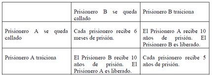 de comunicación posible entre ellos. La policía no tiene evidencia suficiente para condenar a ninguno. Dada esta situación se ofrece a cada uno de los prisioneros lo siguiente: si uno de ellos declara contra el otro y éste permanece en silencio, el traidor es liberado y el que no habló, será condenado a 10 años de prisión. Si ambos permanecen callados, los dos serán condenados a sólo 6 meses de prisión por cargos menores. Si cada uno de ellos declara contra el otro cada prisionero recibirá una condena de 5 años de prisión. Cada uno de los prisioneros debe elegir entre traicionar al otro o permanecer callado. Sin embargo, ninguno de los prisioneros sabe con certeza qué elegirá hacer el otro. La pregunta es simple; ¿cómo deberían actuar los prisioneros?
